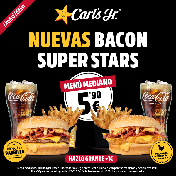 Por sólo 5.90€ hazte con tu menú Mediano Bacon Super Star Beef 🐄 o chicken 🐥